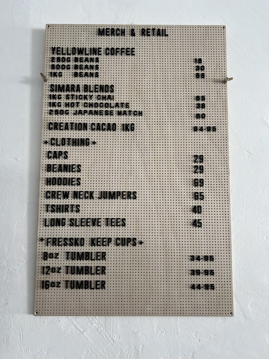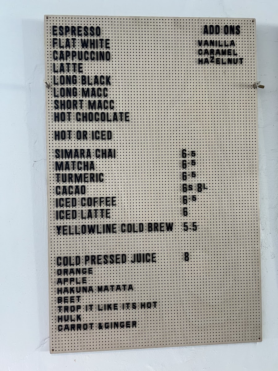 The menu at Kerfuffle on the Corner offers a variety of beverages primarily focused on coffee and specialty drinks, suitable for breakfast, coffee breaks, or casual dining. Visitors can expect a selection of espresso-based coffees including Espresso, Flat White, Long Black, Cappuccino, Latte, Short Macchiato, and Long Macchiato, alongside hot drinks such as Hot Chocolate, Simara Chai, Matcha, Turmeric, and Cacao. Cold options include Iced Coffee, Iced Latte, and Yellowline Cold Brew.